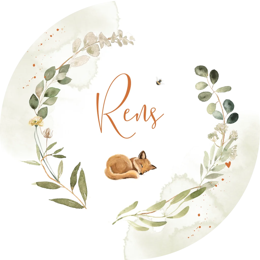 Een lieve ronde raamsticker met een groene watercolour achtergrond. In de krans van bladeren ligt een vosje te slapen. Pas het ontwerp naar wens aan in onze online editor.