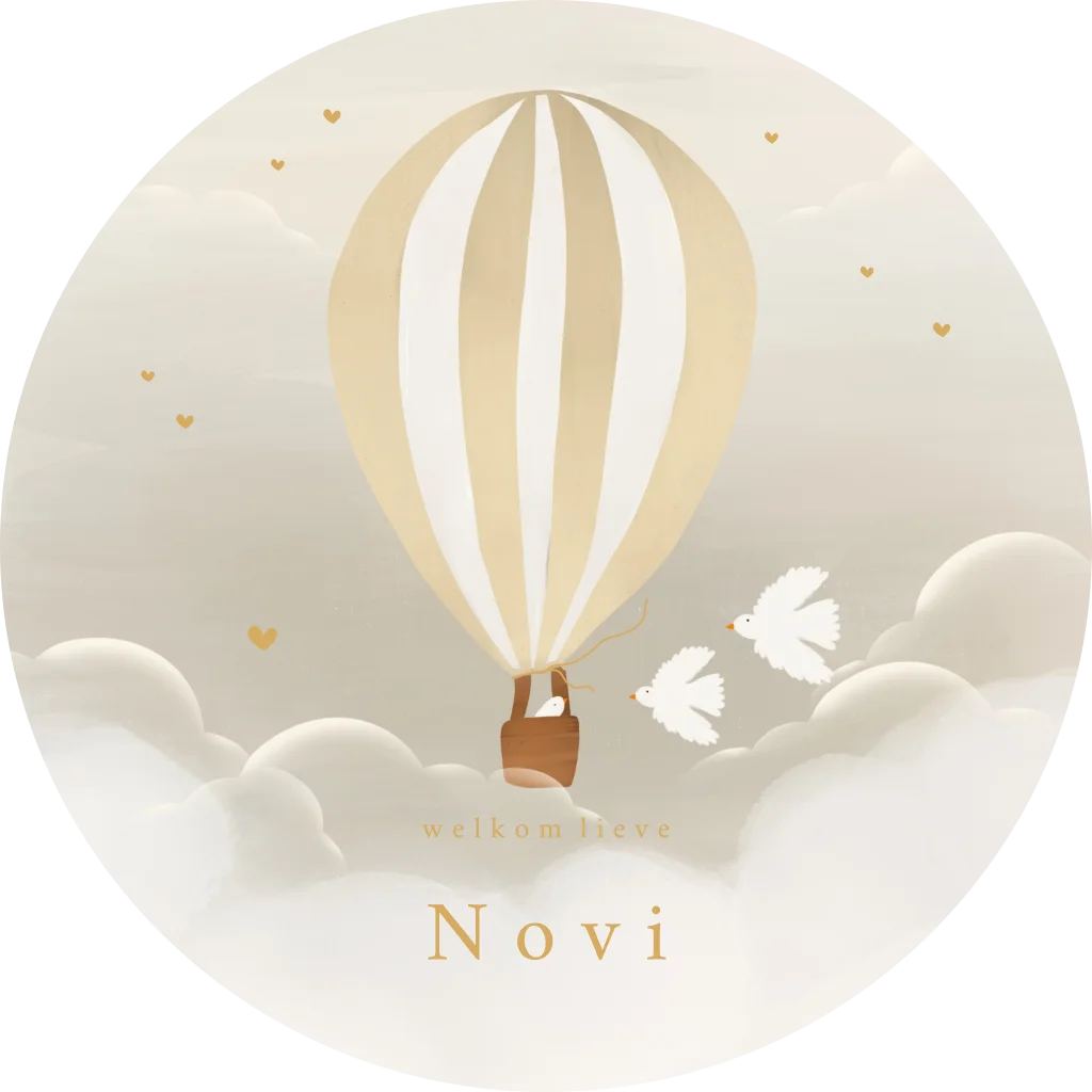 Kondig de geboorte van jullie kindje aan met deze stijlvolle ronde raamsticker. De sticker heeft een beige achtergrond met daarop een luchtballon en zachte wolkjes en is naar wens aan te passen in onze online opmaaktool. Tip: zonder geboortedatum kun je de sticker al voor de geboorte in huis halen!
