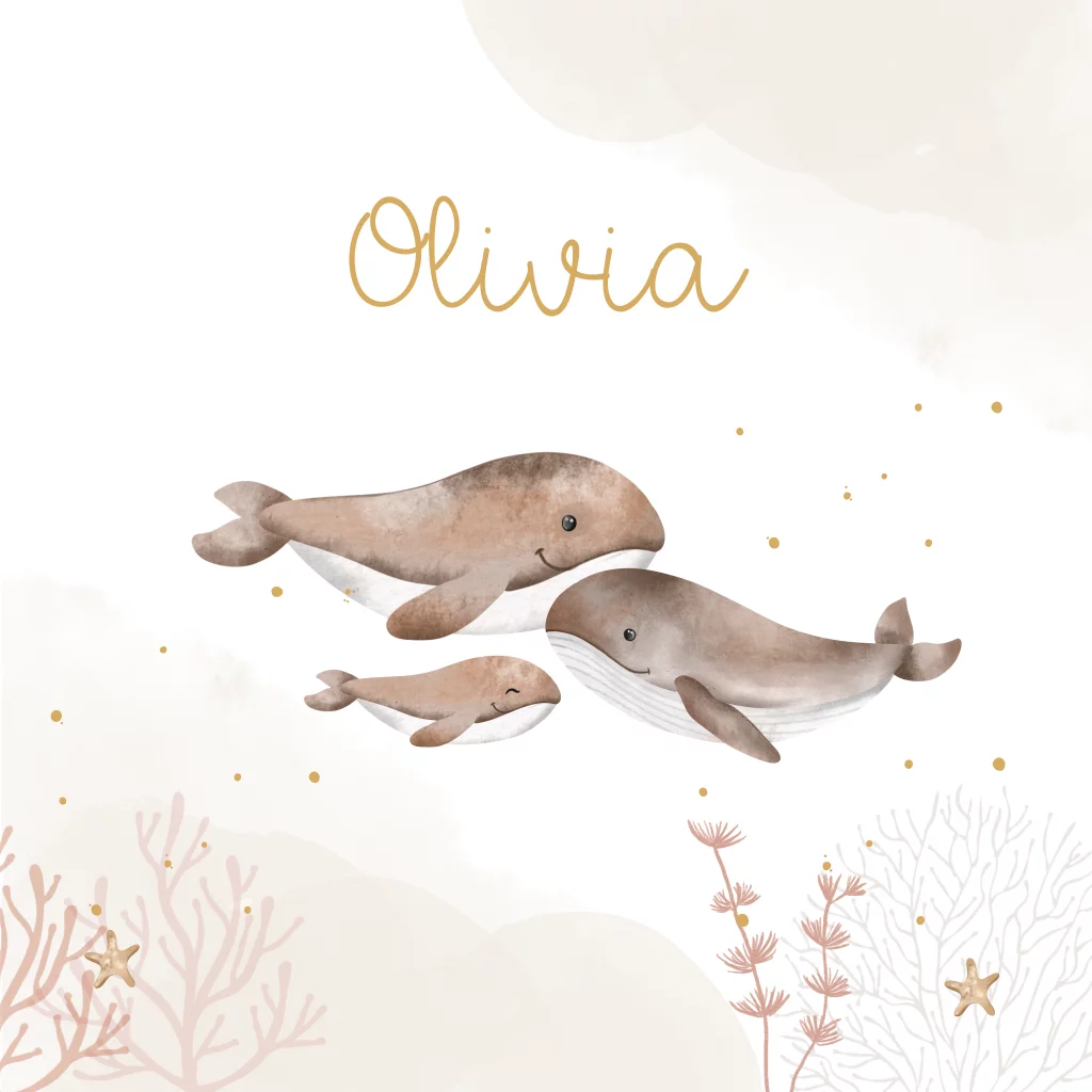 Een lieve raamsticker passend bij het geboortekaartje. De sticker heeft beige watercolour en prachtige illustraties van walvissen in de zee. Pas het ontwerp naar wens aan in onze online editor.