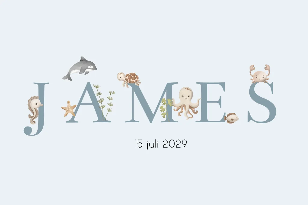 Laat de hele buurt weten dat je kleintje is geboren met deze raamsticker! De sticker heeft een lichtblauwe achtergrond met de illustraties van verschillende zeedieren. Pas de sticker helemaal naar wens aan in onze online editor.