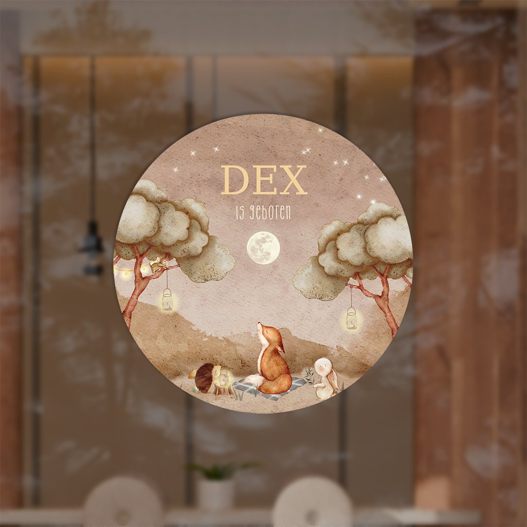 Kondig de geboorte van jullie baby aan met deze ronde raamsticker, met prachtige illustraties van bosdieren en de naam van jullie kindje. De sticker is naar wens aan te passen in onze online opmaaktool.