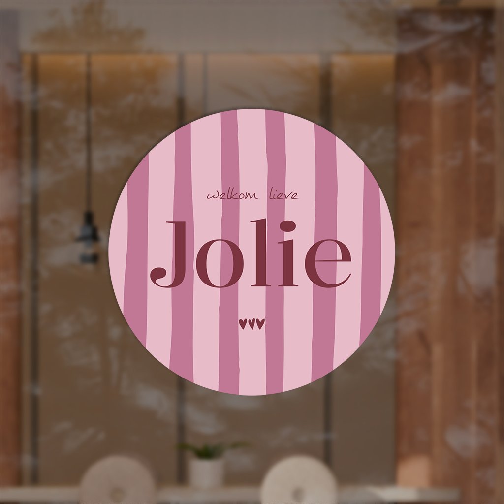 Kondig de geboorte van jullie kindje aan met deze ronde raamsticker, met prachtige roze strepen en de naam van jullie dochter. De sticker is naar wens aan te passen in onze online opmaaktool.