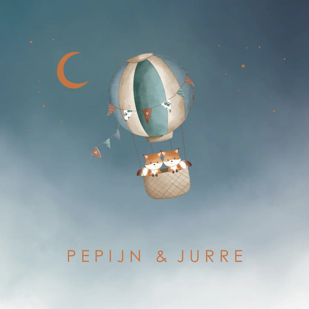 Laat iedereen weten dat jullie tweeling is geboren met deze super leuke raamsticker! Op de blauwe raamsticker staat een afbeelding van een luchtballon waar twee vosjes in zitten, lief!