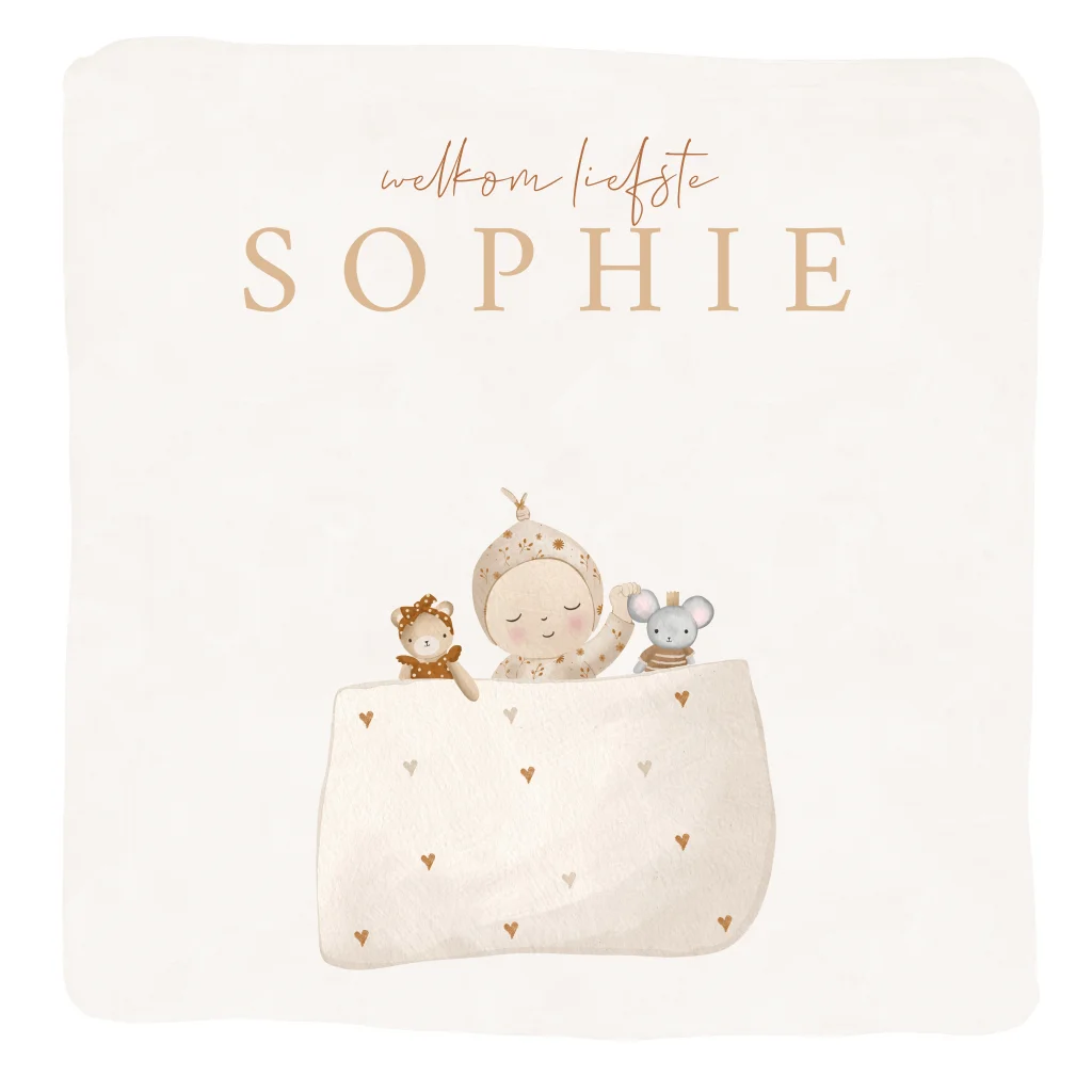 Een schattige raamsticker voor jouw kindje. De sticker heeft een beige kader met in het midden een illustratie van een baby onder een hartjes deken. Pas het ontwerp naar wens aan in onze online editor.