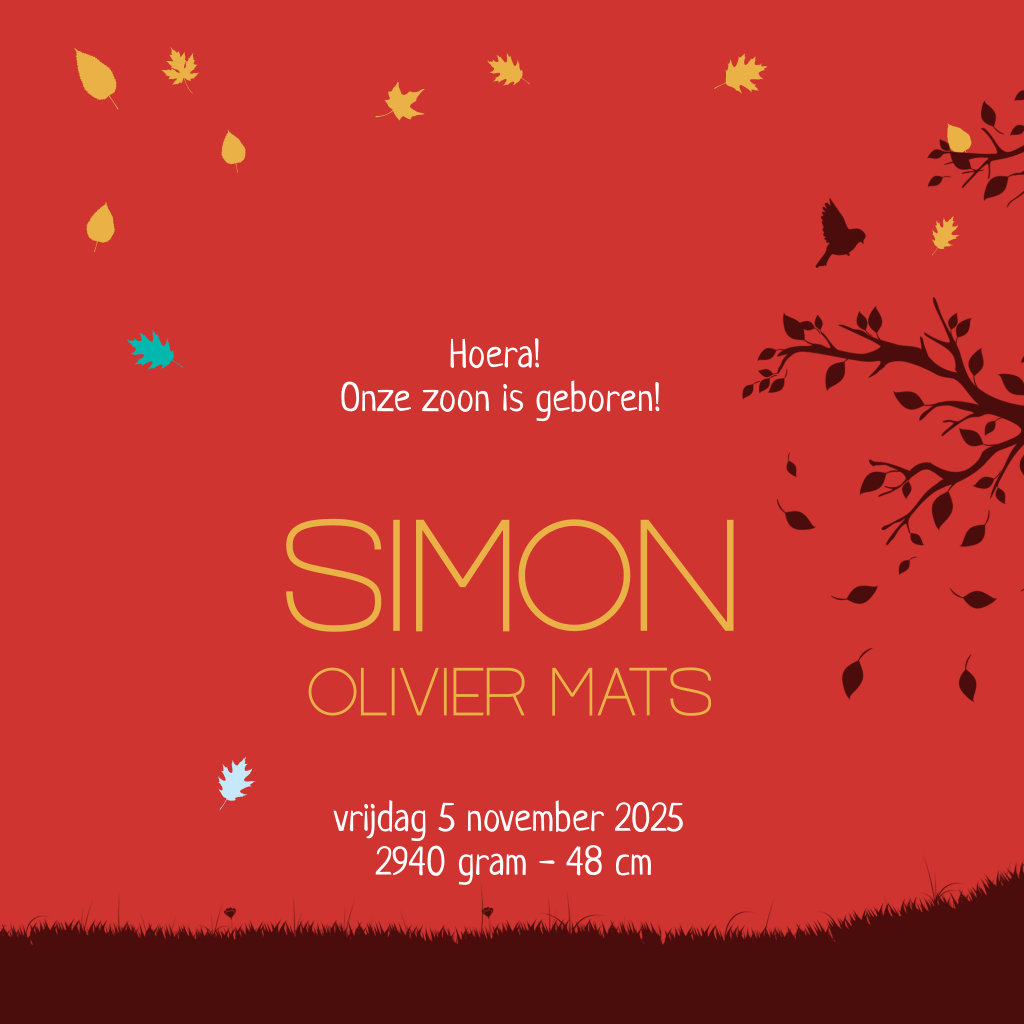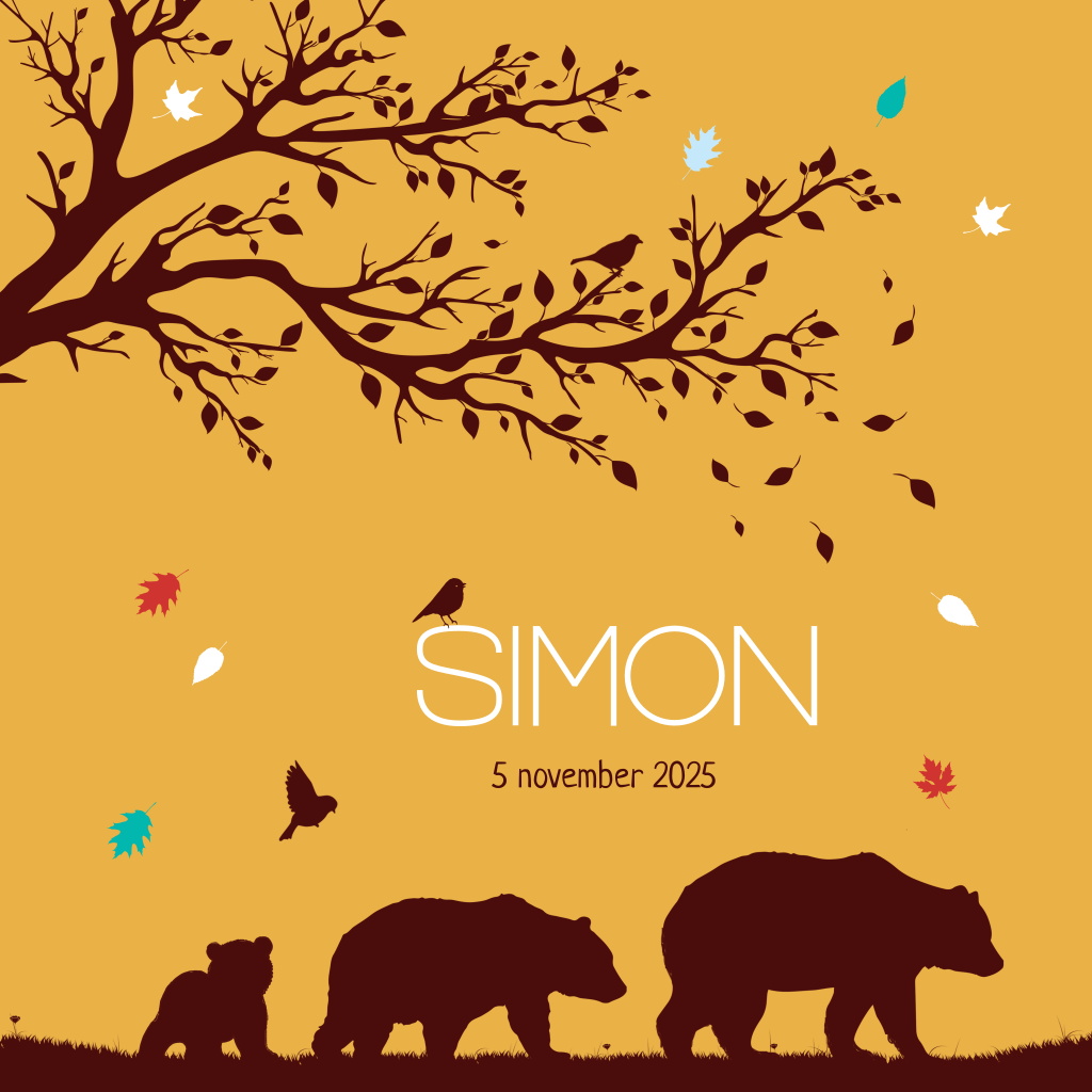 Hip herfst-geboortekaartje voor een jongen! Een silhouet van een papa, mama en babybeer, een boom met vallende blaadjes en vogeltjes in okergeel, warmbruin en andere mooie herfsttinten. Toch liever andere kleuren? Verander ze gemakkelijk zelf.
