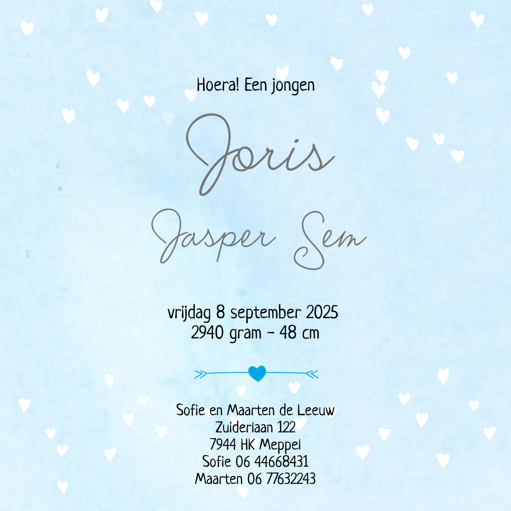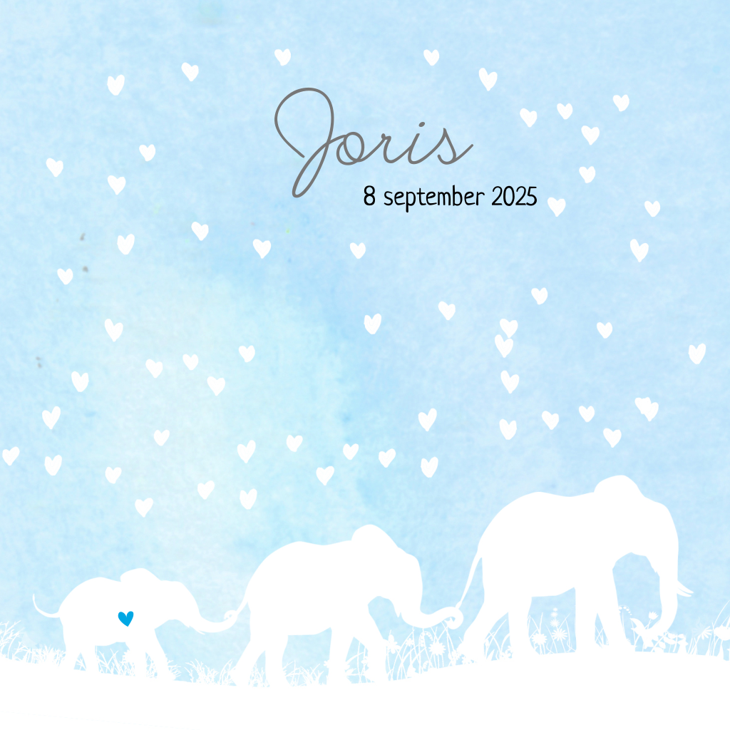 Lief geboortekaartje met drie olifantjes op een blauwe watercolour achtergrond met allemaal kleine hartjes. Pas het kaartje makkelijk aan in onze editor.