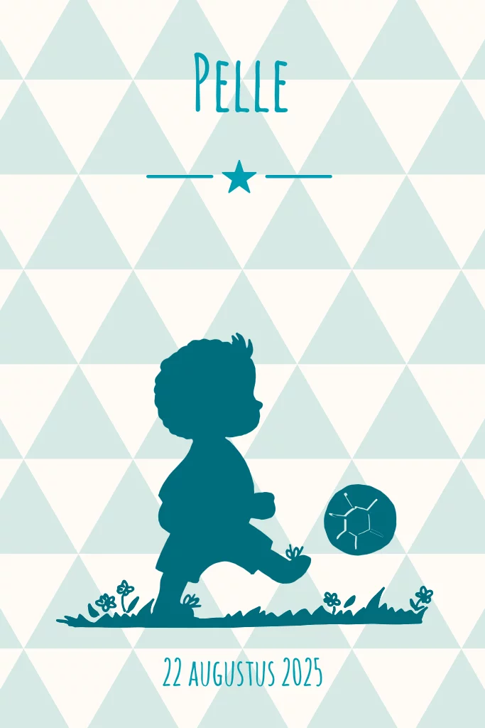 Stoer en hip geboortekaartje voor de geboorte van je zoon in blauw/groentinten met een silhouet van een jongetje die aan het voetballen is op een achtergrond van driehoekjes.