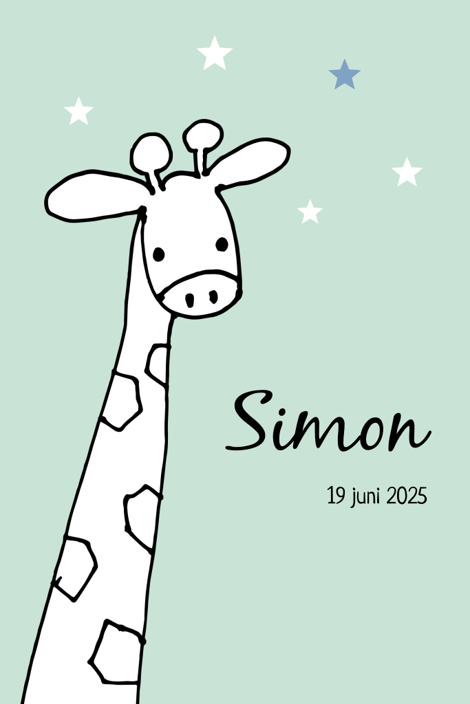 Lief mintgroen geboortekaartje met een lieve getekende girafje en sterretjes. Aan de binnenkant staan hippe icoontjes om de gewicht en lengte van je zoon aan te geven. Bepaal zelf de lettertypes en achtergrondkleuren.