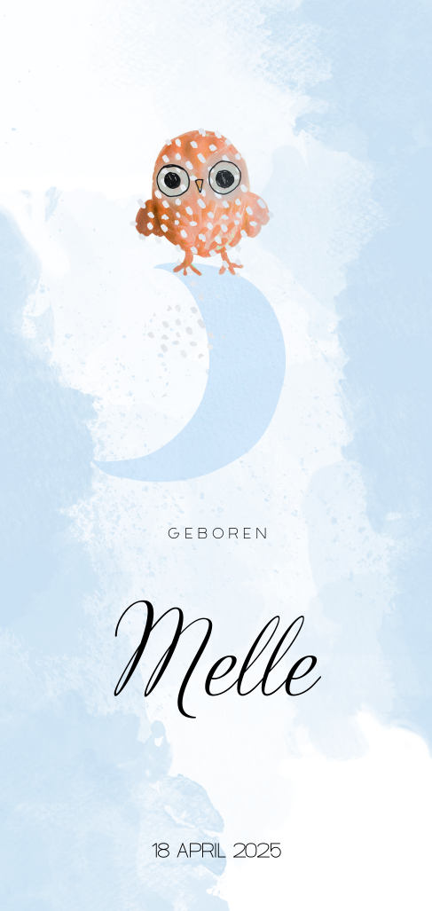 Schattige geboortekaart voor je zoontje met een lieve illustratie van een uil zittend op een maan. De licht blauwe watercolour maken dit geboortekaartje helemaal af!