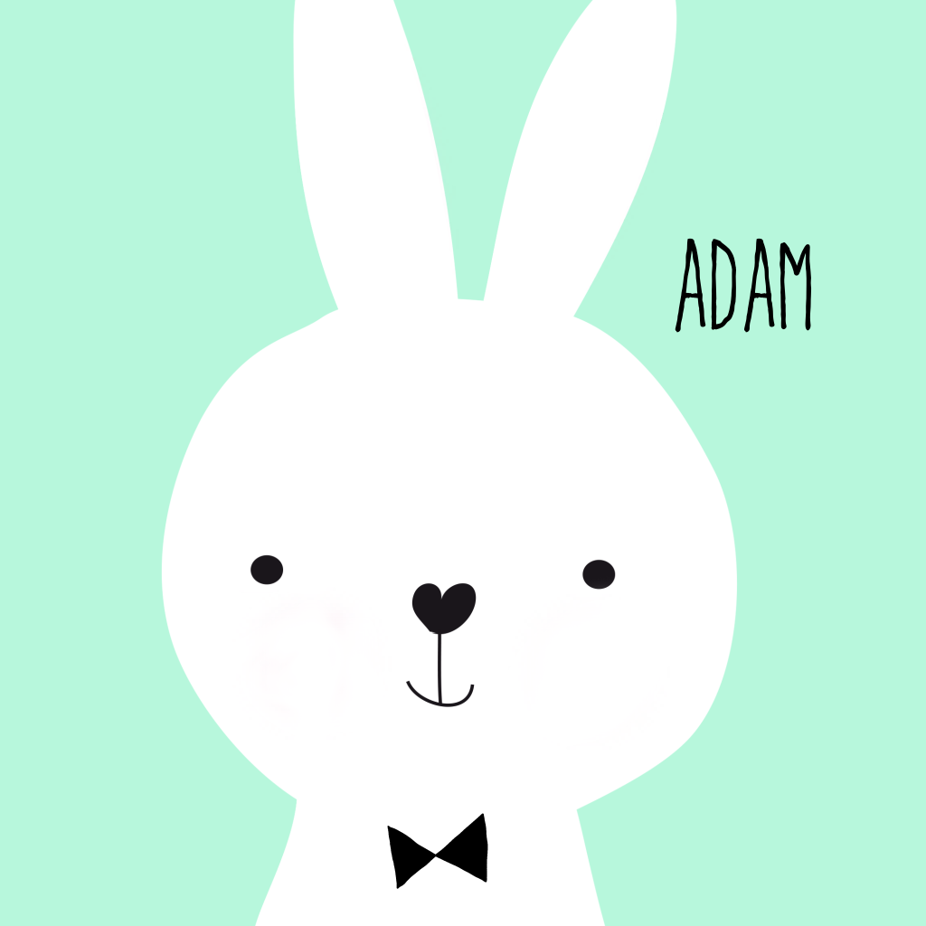 Lief geboortekaartje met een schattige witte konijn met strikje op een mintgroene achtergrond. Lettertypes en achtergrond kleuren zijn zelf aan te passen.
