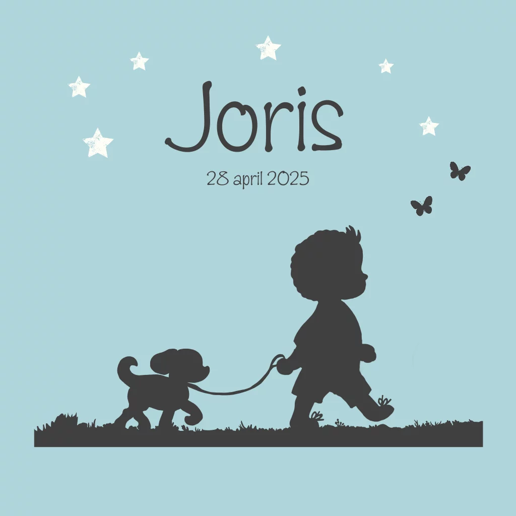 Origineel blauw geboortekaartje met een silhouet van een jongetje lopend met zijn hondje. Verander zelf de kleuren en lettertypes naar wens en smaak.