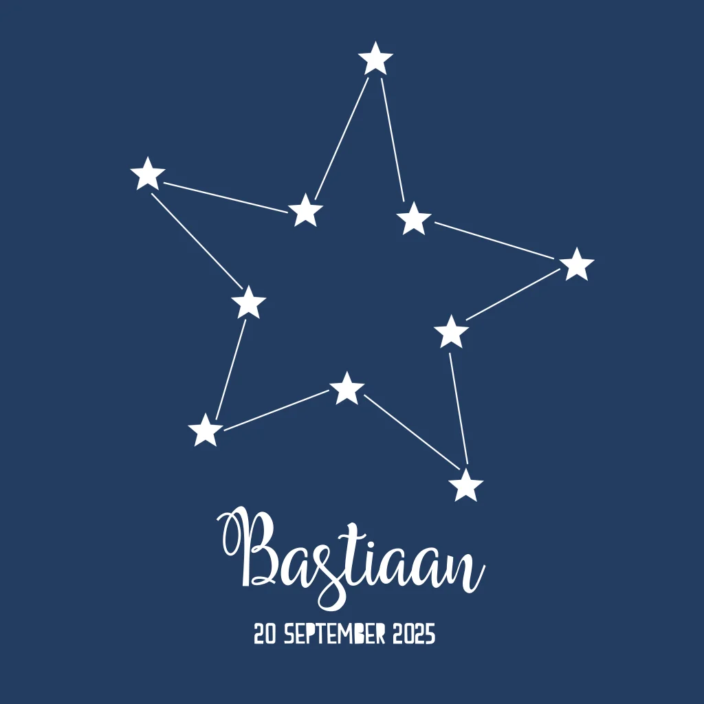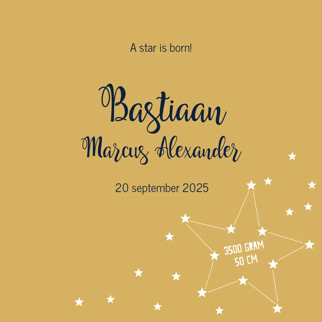 Stoer en origineel geboortekaartje met een sterrenbeeld in de vorm van een ster in donkerblauw en okergeel.