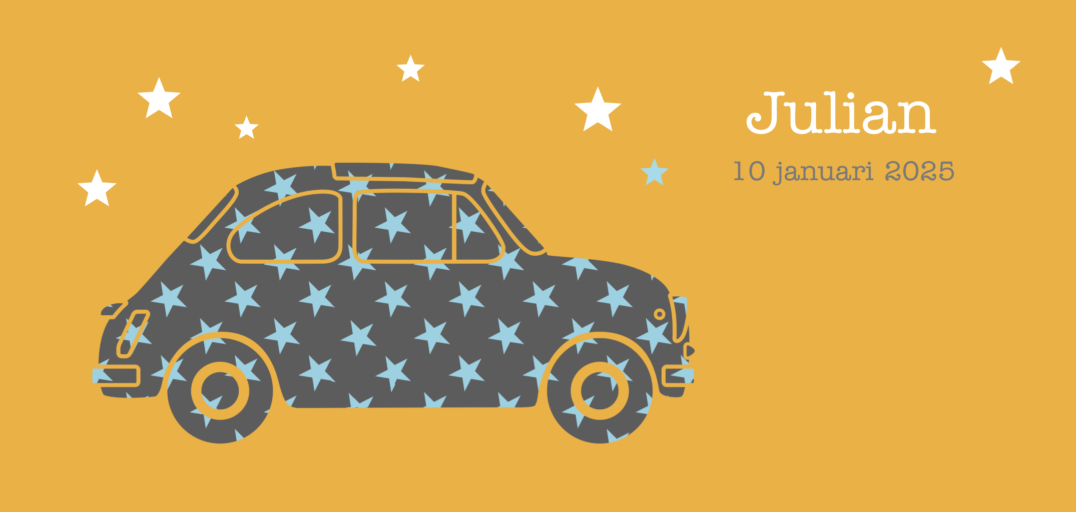 Stoere geboortekaart voor je zoontje met een fiat oldtimer met sterrentjes op een okergele achtergrond. Liever een andere achtergrondkleur? Pas het eenvoudig zelf aan in de online editor!