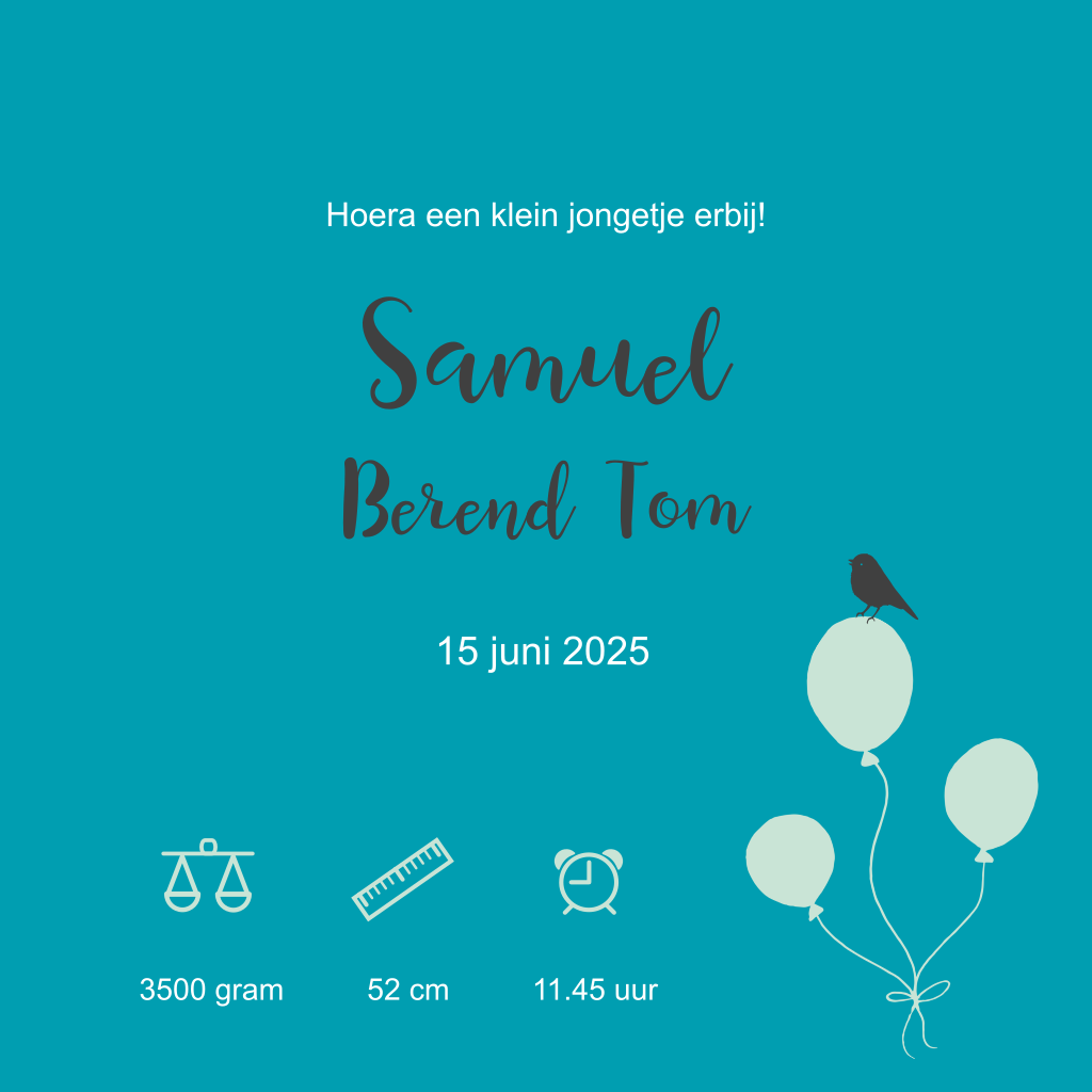 Stoer geboortekaartje voor de geboorte van je zoontje met een silhouet van een jongetje op een trekker met allemaal verschillende boerderijdieren zoals een varken, koe, gans, hond, kip en ballonnen. Pas lettertypes en kleuren aan naar je eigen smaak.