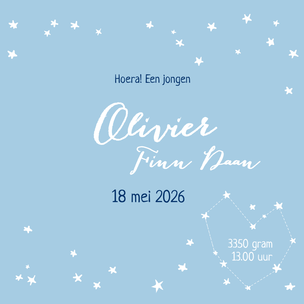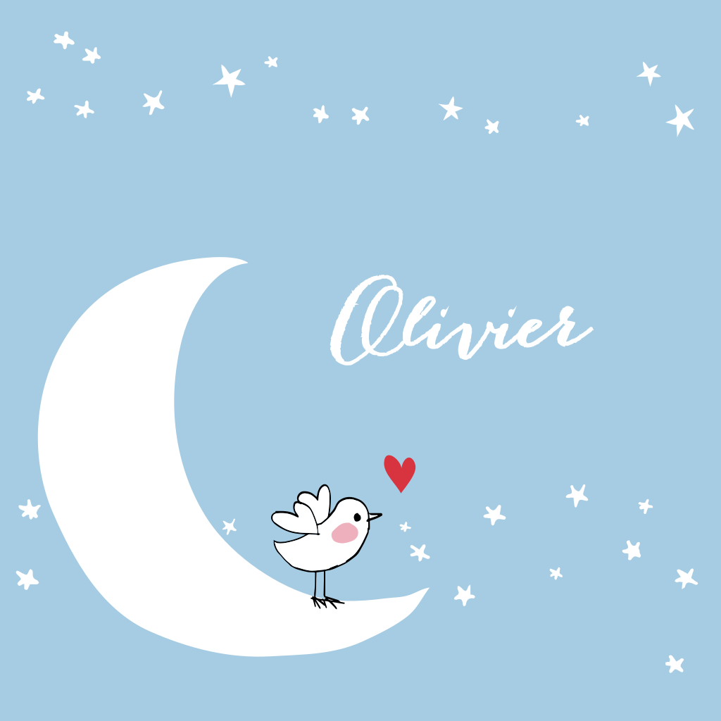 Lief getekend kaartje voor de geboorte van een jongetje met een vogeltje zittend op de maan met op de achtergrond sterretjes.