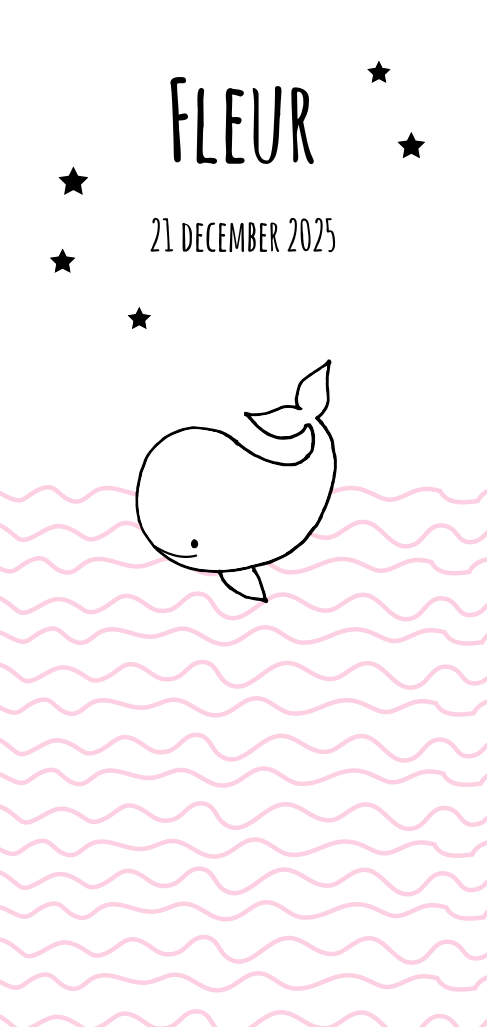 Lief geboortekaartje voor een meisje met een getekend walvisje in zwart-wit zwemmend in een roze-witte zee. Pas het kaartje makkelijk aan in de editor.