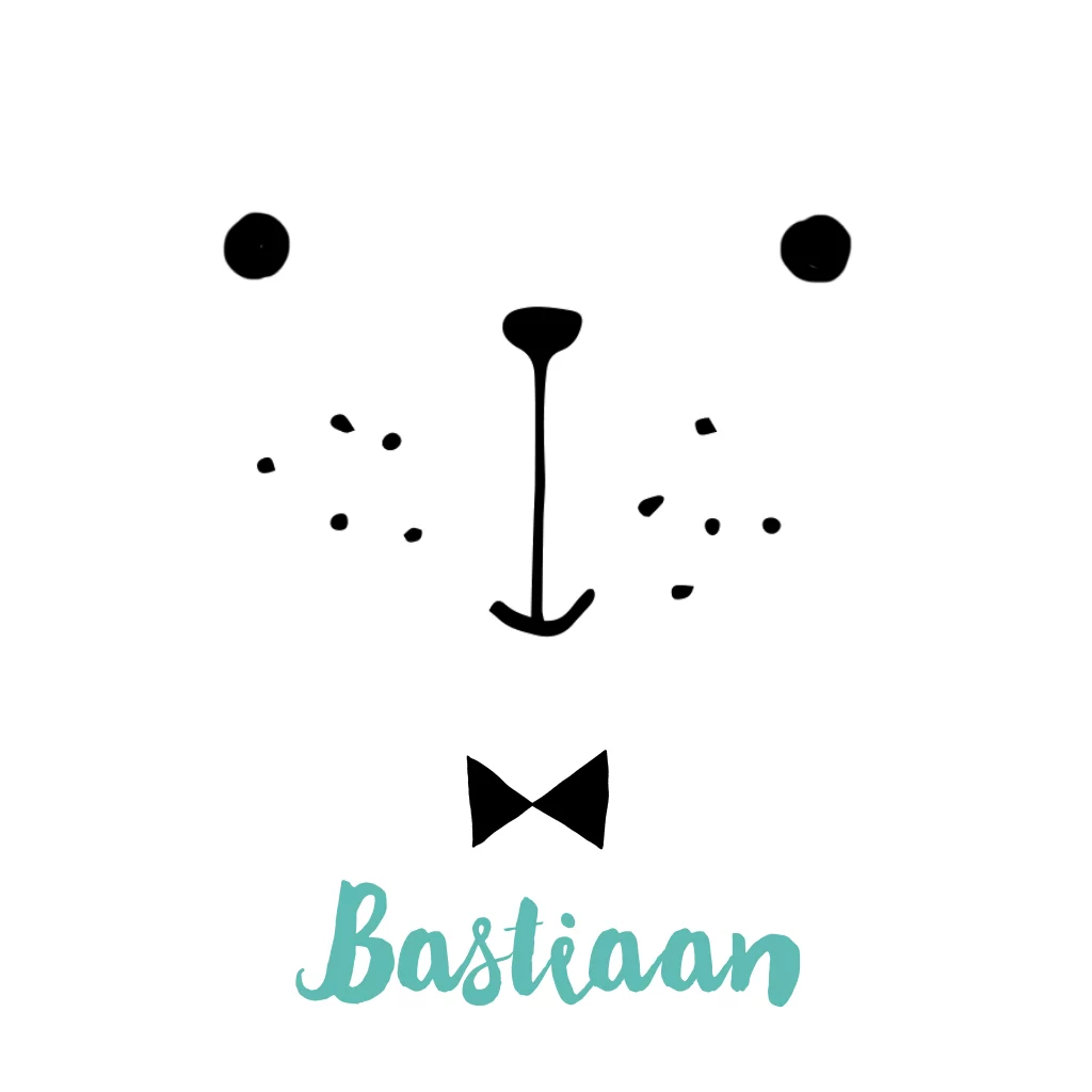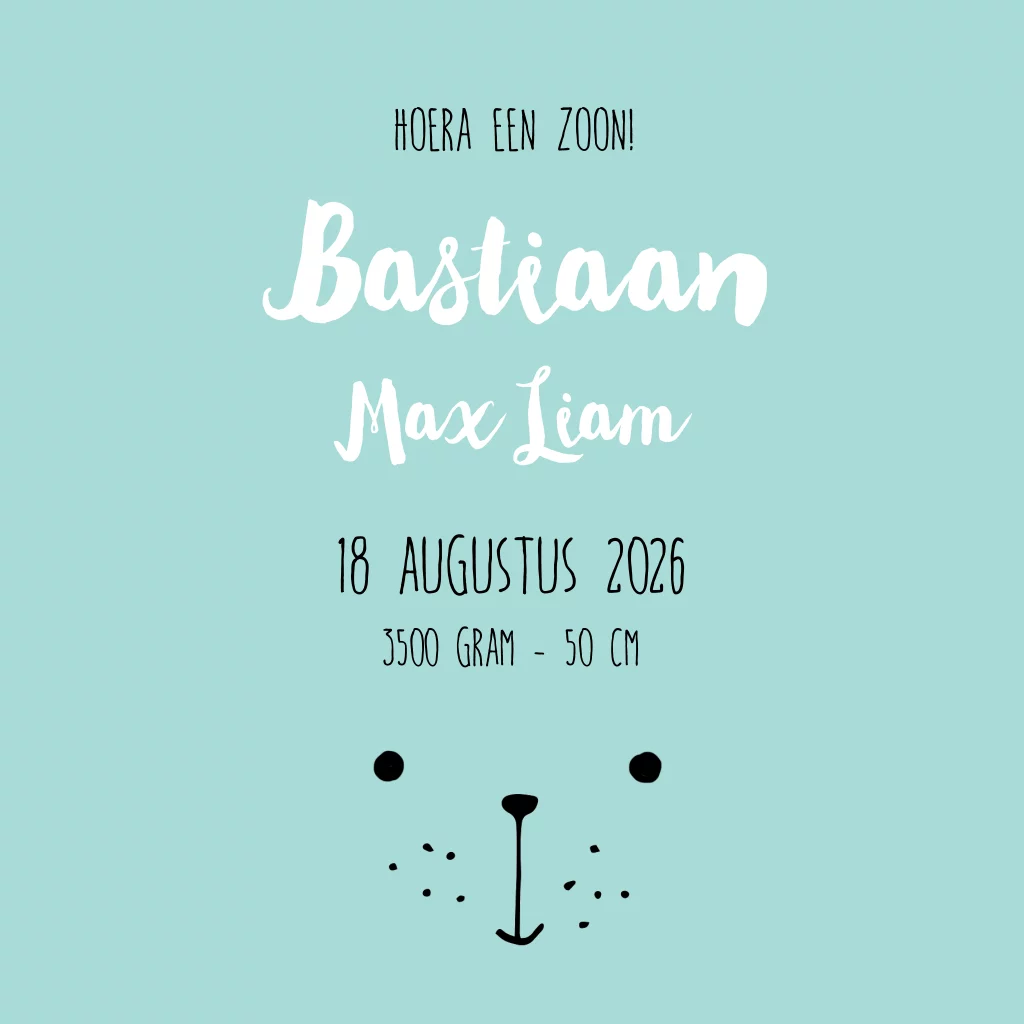 Geboortekaartje voor een jongetje in zwart-wit met mint met snoezig getekend snuitje. Verander eventueel zelf de kleur naar wens.