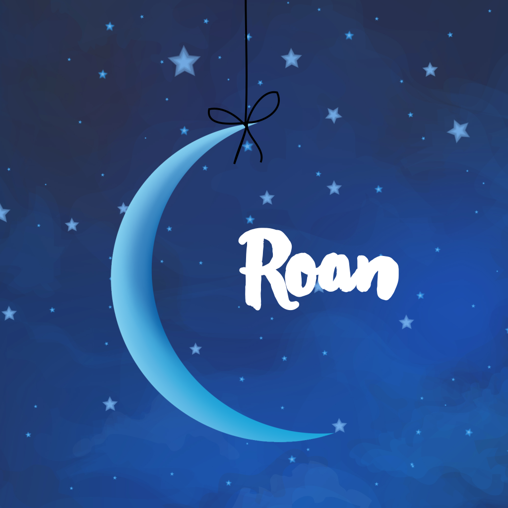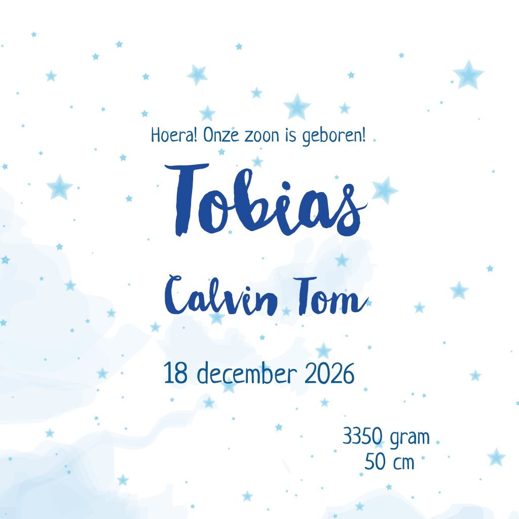Een romantisch blauw geboortekaartje met sterrenhemel en een maan met strikje.