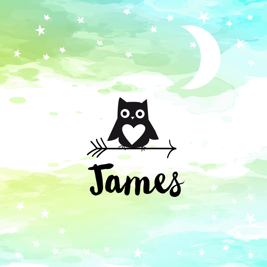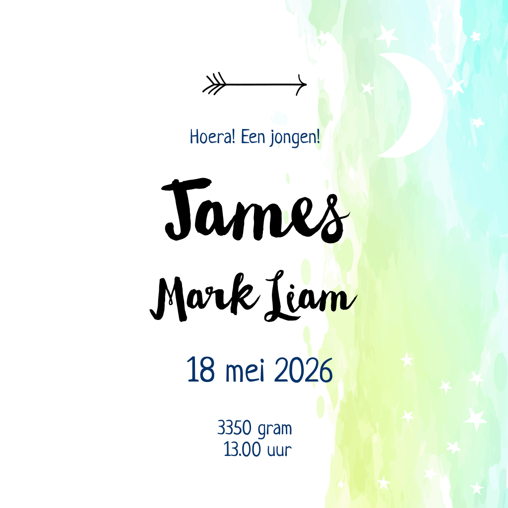 Geboortekaartje voor een jongetje met uiltje zittend op een pijl met kleurrijke groen/blauwe lucht met maan en sterren. Met dit kaartje steunt u Cordaid Memisa.