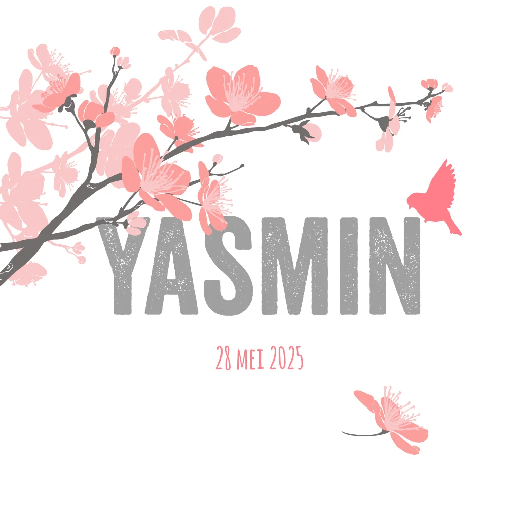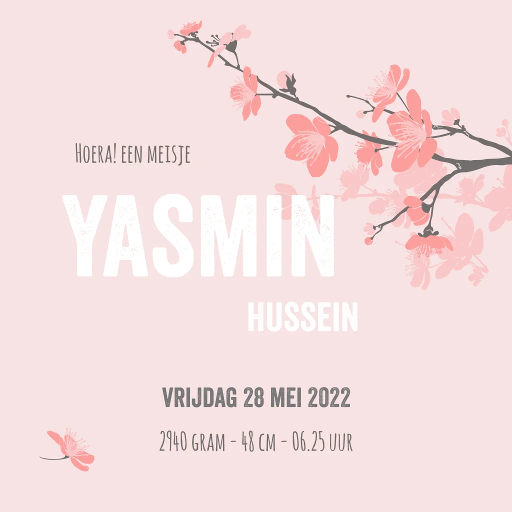 Lief en romantisch geboortekaartje voor een Islamitisch meisje dat in de lente geboren wordt. Echt schattig met een roze boom tak met roze bloesem.Totaalprijs: 0 |