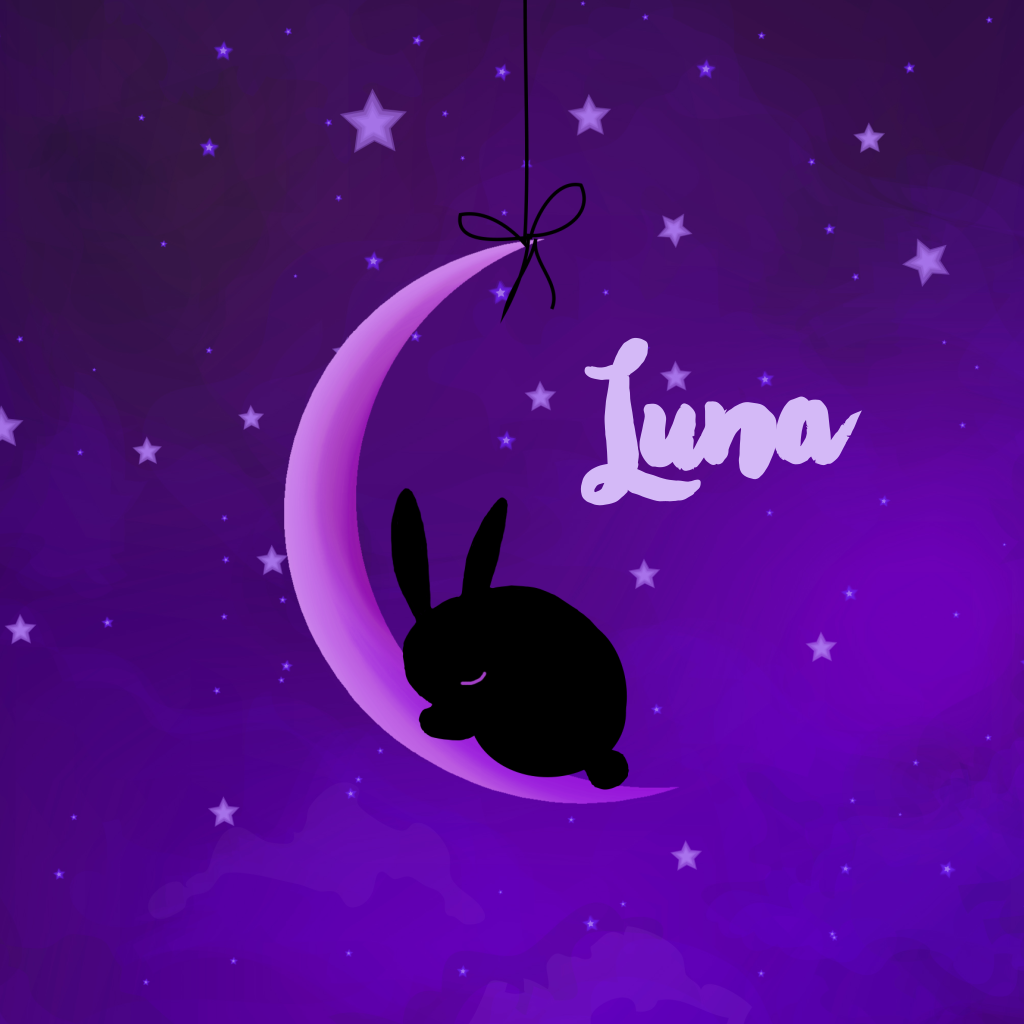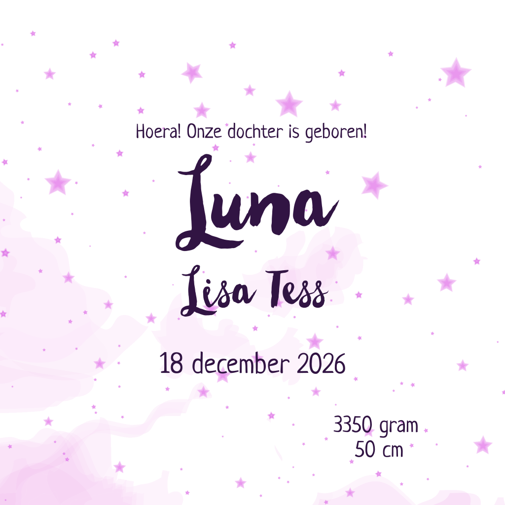 Superlief geboortekaartje voor een meisje met een schattig slapend konijntje liggend op de maan op een paarse sterrenhemel..