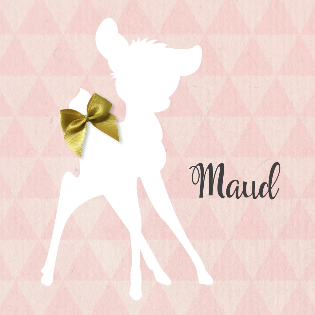 Schattig kaartje voor de geboorte van een meisje met een silhouet van een lief hertje op een pastelroze driehoekjes achtergrond. Maak dit kaartje helemaal af door er een écht strikje op te plakken.