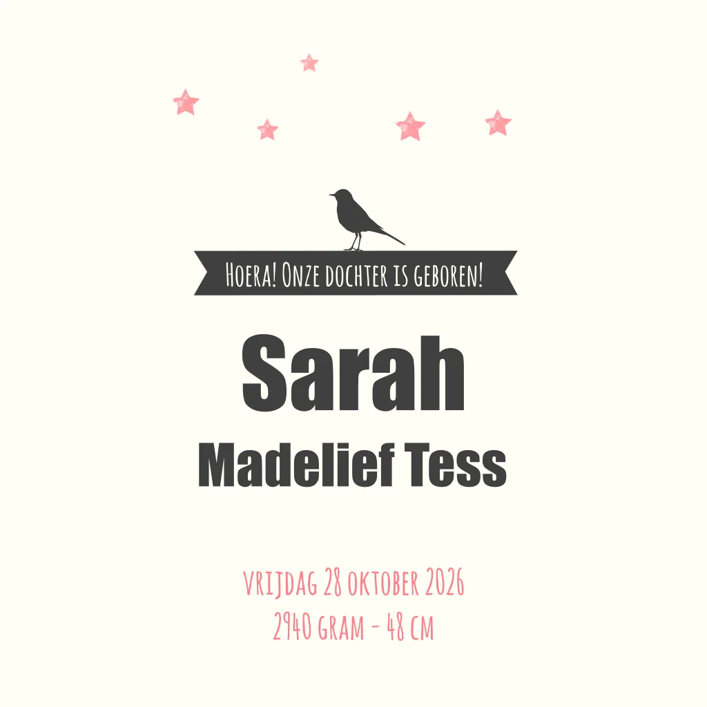 Lief geboortekaartje van een meisje dat op de maan zit met sterren en een vogel en pijl aan de binnenkant. Verander de kleuren eenvoudig zelf.