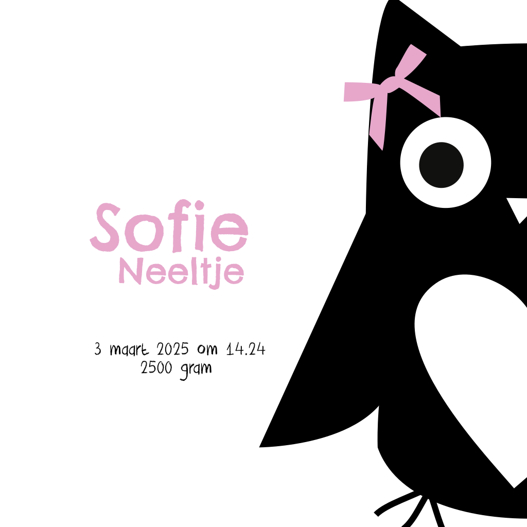 Geboortekaartje in lief ontwerp met hartjes en uil en accent van hout.