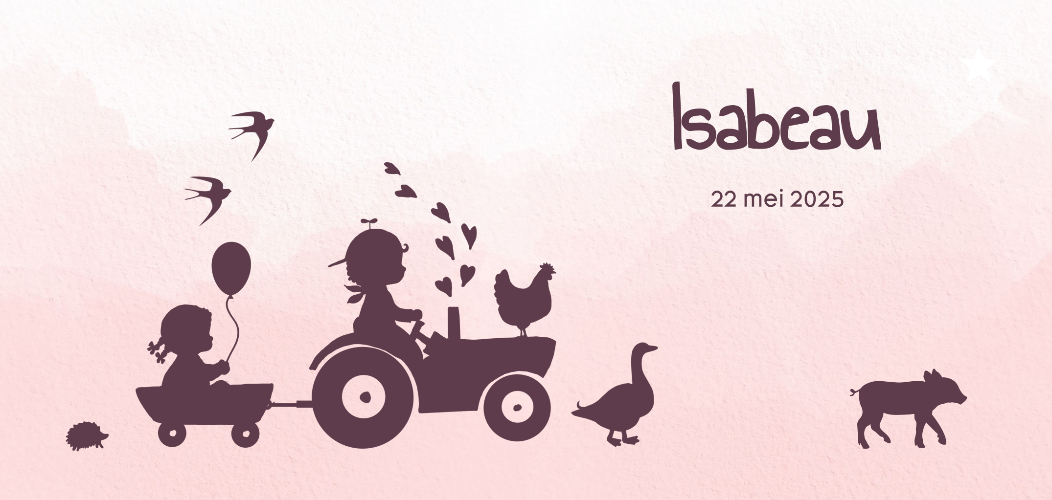 Origineel geboortekaartje voor de geboorte van je dochtertje. Met hip silhouetje van een baby zusje die met haar grote broer op de trekker zit met allemaal boerderij dieren zoals een biggetje, een haan, een egeltje en een gans.