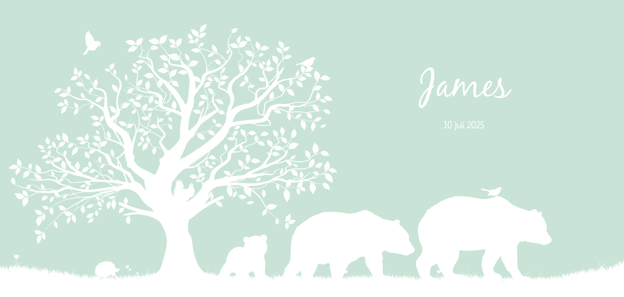 Lief silhouet geboortekaartje met 3 beren, een eekhoorntje, egeltje, vogels en een boom. De kleuren en lettertypes kun je zelf aanpassen aan jouw voorkeur!