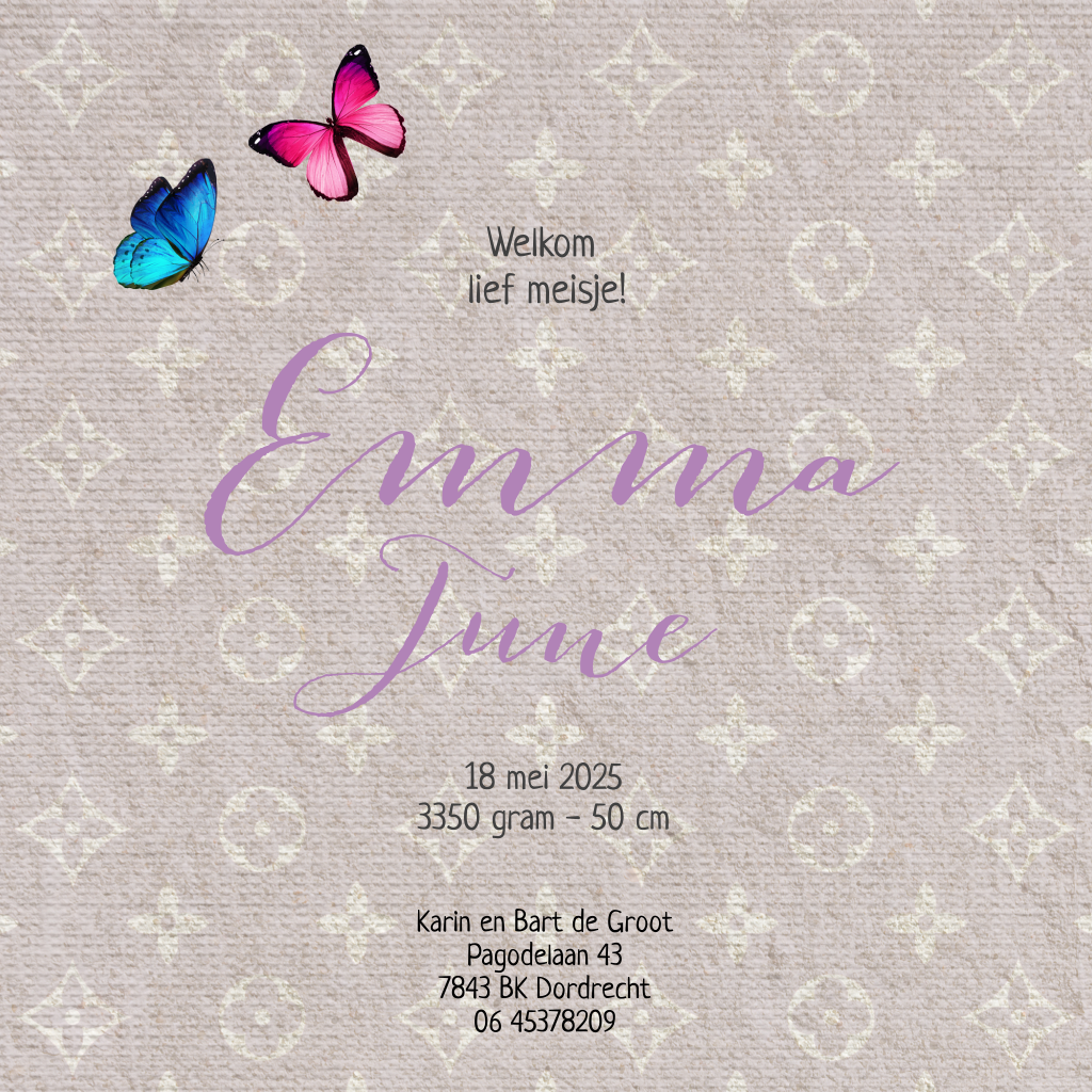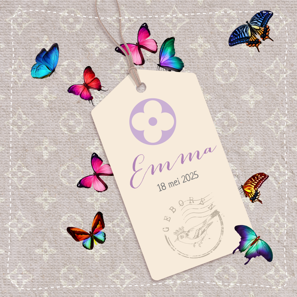 Lief geboortekaartje met vrolijke vlinders op stof met een label waarop tekst is geschreven. Pas de tekst aan met de naam en geboortedatum van je baby.