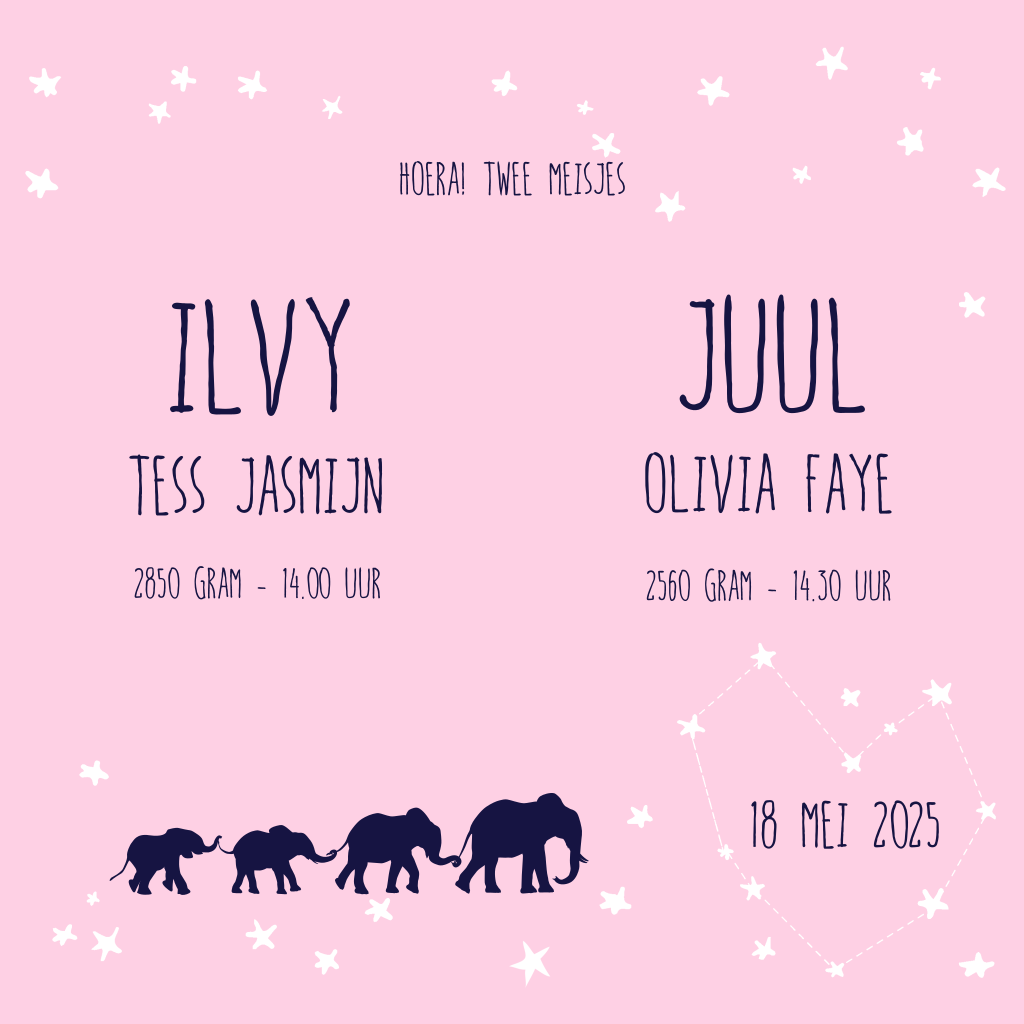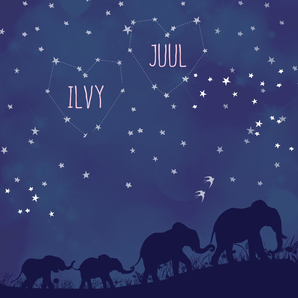 Vier wandelende olifanten met zwaluwen en een prachtige sterrenhemel, wat een romantisch geboortekaartje! Dit kaartje is leuk voor een tweeling. Rondom de namen staan sterrenbeelden in de vorm van een hart.