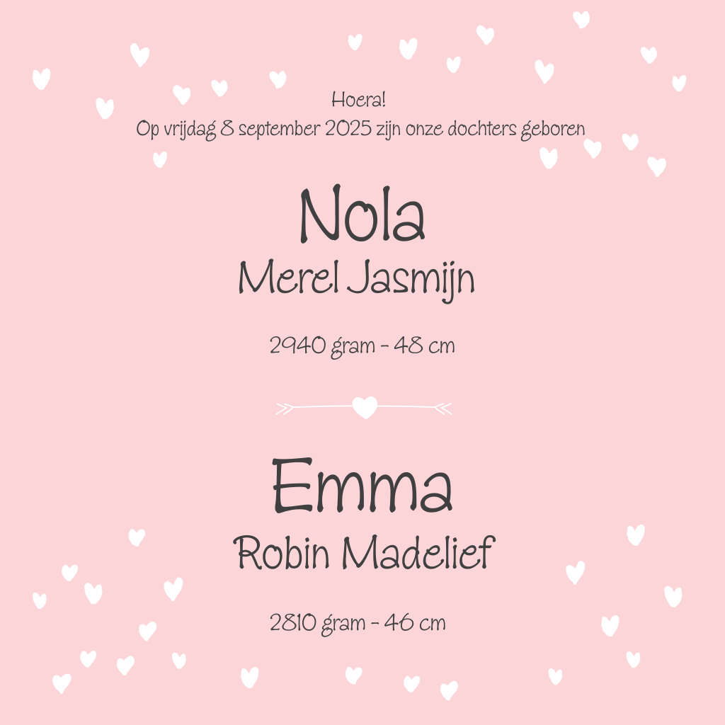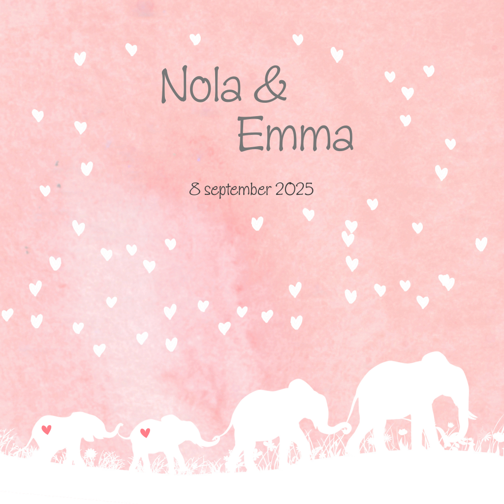 Lief geboortekaartje voor twee meisjes met silhouetten van een rij olifantjes op een pastelroze watercolour achtergrond met allemaal kleine witte hartjes.
