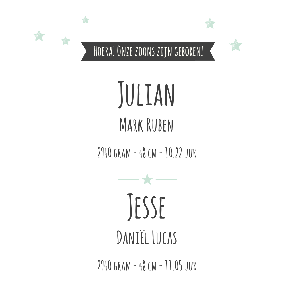 Lief mintgroen geboortekaartje voor een jongenstweeling met jongetjes zittend in het gras met konijntjes, een vogel en vlinders. De witte rand en de sterren maken dit hippe kaartje helemaal af!