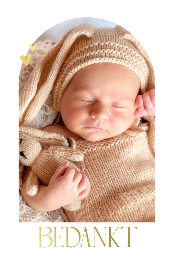 Mooie bedankkaart in boogvorm met foto van je eigen kindje en goudfolie elementen. Eenvoudig te personaliseren in de online editor.