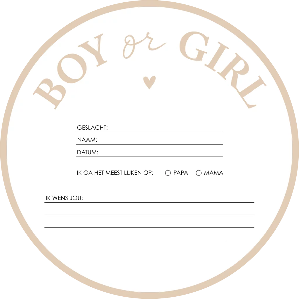 Voorspel samen met je familie en vrienden welk geslacht het is met onze invulkaarten. Deze kaarten zijn zelf te bewerken en in te vullen op de gender reveal. Het kaartje heeft een ronde vorm met beige elementen. Bovenaan het kaartje lees je de tekst: boy or girl?Heb je de bijpassende producten al gezien?