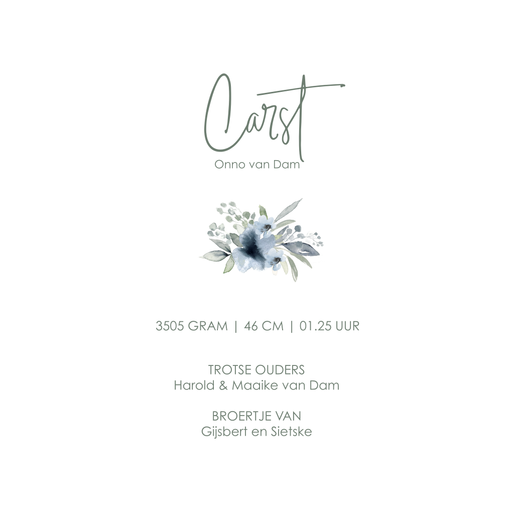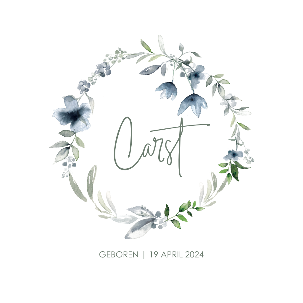 Een heel stijlvol geboortekaartje voor jouw toekomstige zoon. Dit kaartje heeft een stijlvol design met een bloemenkrans in watercolour. De naam is geschreven in sierlijk lettertype. In onze online editor kan je persoonlijke informatie aanpassen en toevoegen.