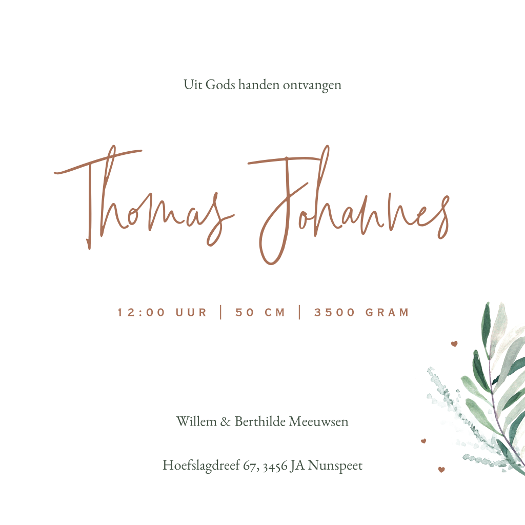 Stijlvol geboortekaartje jongen met eucalyptus takjes en roestbruin