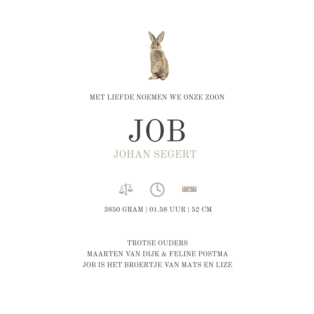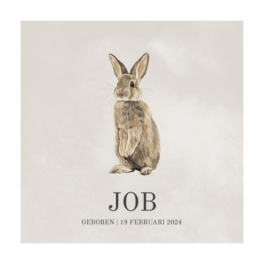Dit babykaartje met een getekend konijn is super schattig. Het konijntje staat op een lichtbruine achtergrond van waterverf en in een wit kader.