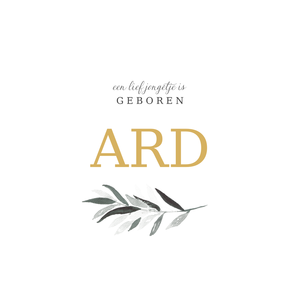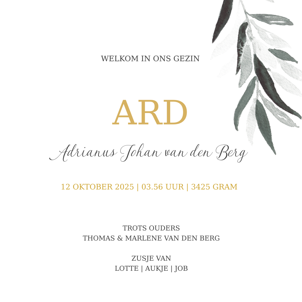 Stijlvol geboortekaartje voor de geboorte van je zoon met een aquarel takje met bladeren op een minimalistische witte achtergrond.