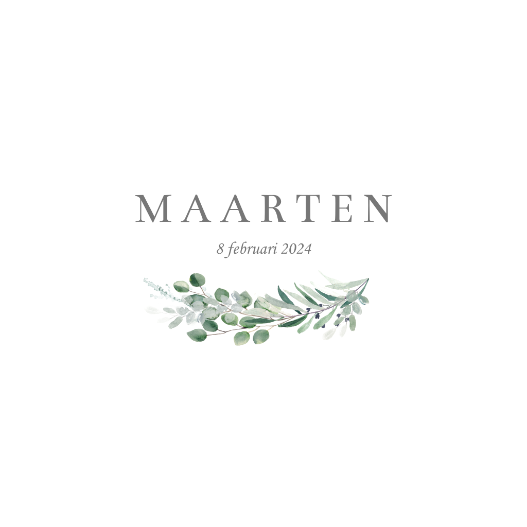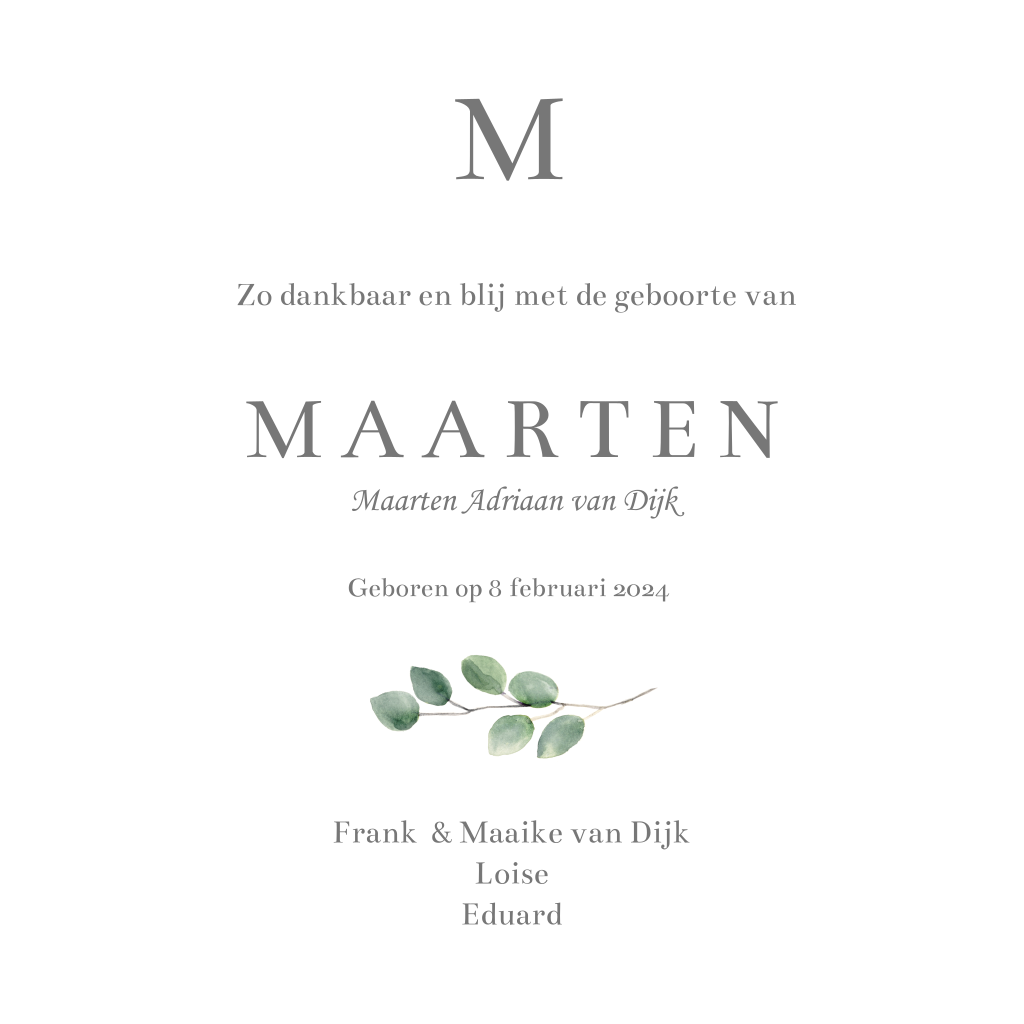 Stijlvol geboortekaartje voor je pasgeboren dochtertje met een minimalistisch bladertakje op een witte achtergrond.