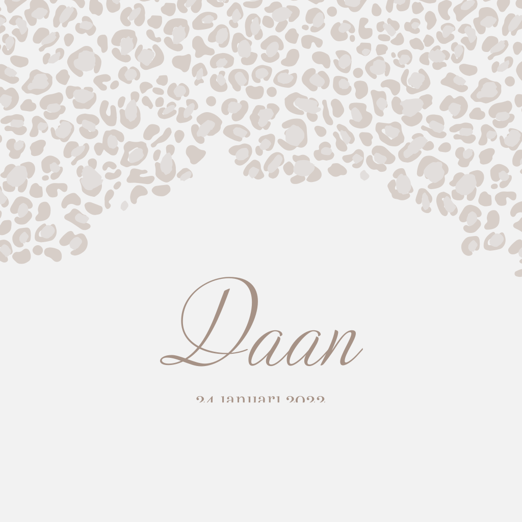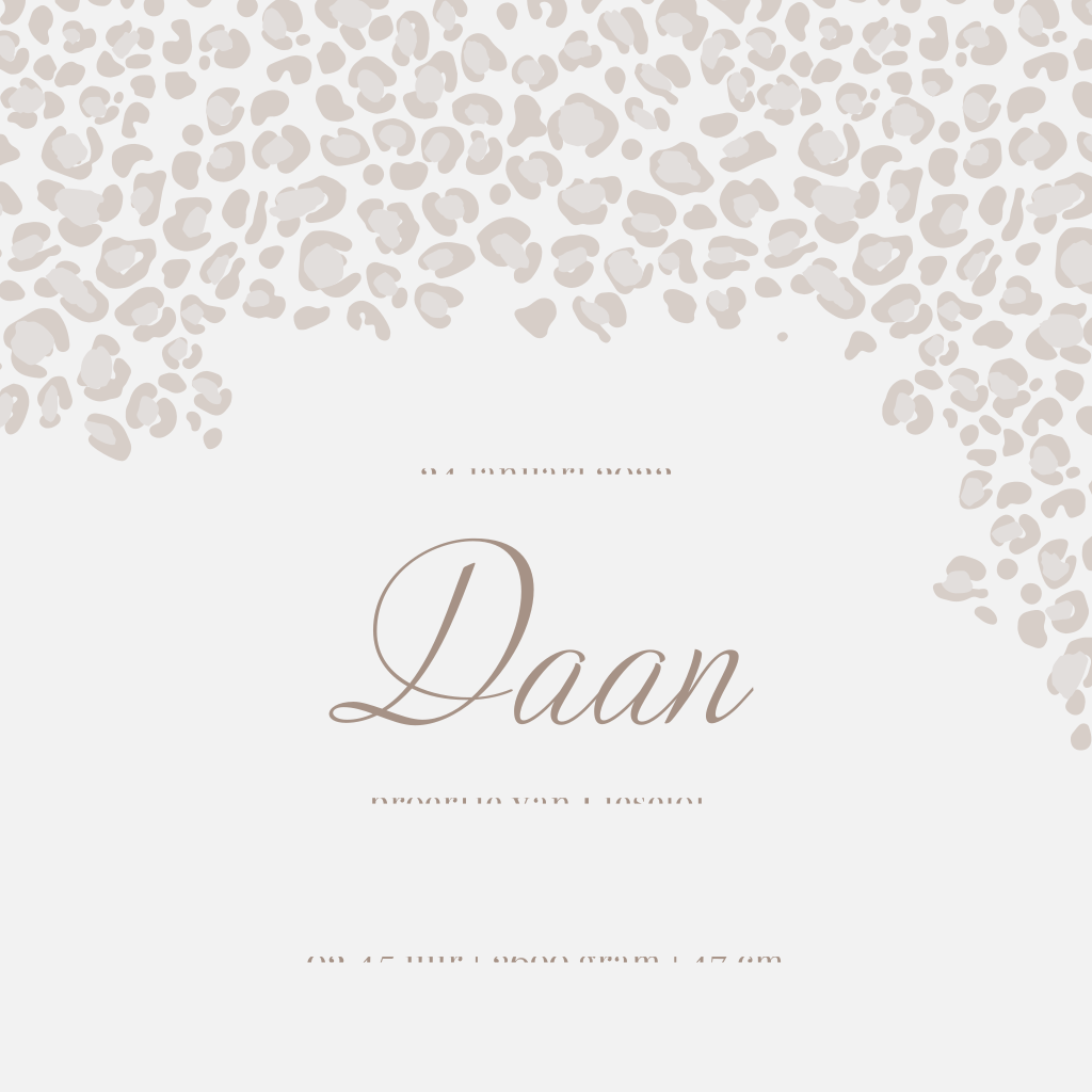 Dit geboortekaartje is echt een unieke combinatie van klassiek en stoer! Het stijlvolle lettertype is opvallend aan deze kaart en het panterprintpatroon geeft hem net even iets extra's. Kleuren en lettertypes kunnen naar wens worden aangepast. Leuk voor een zoontje!