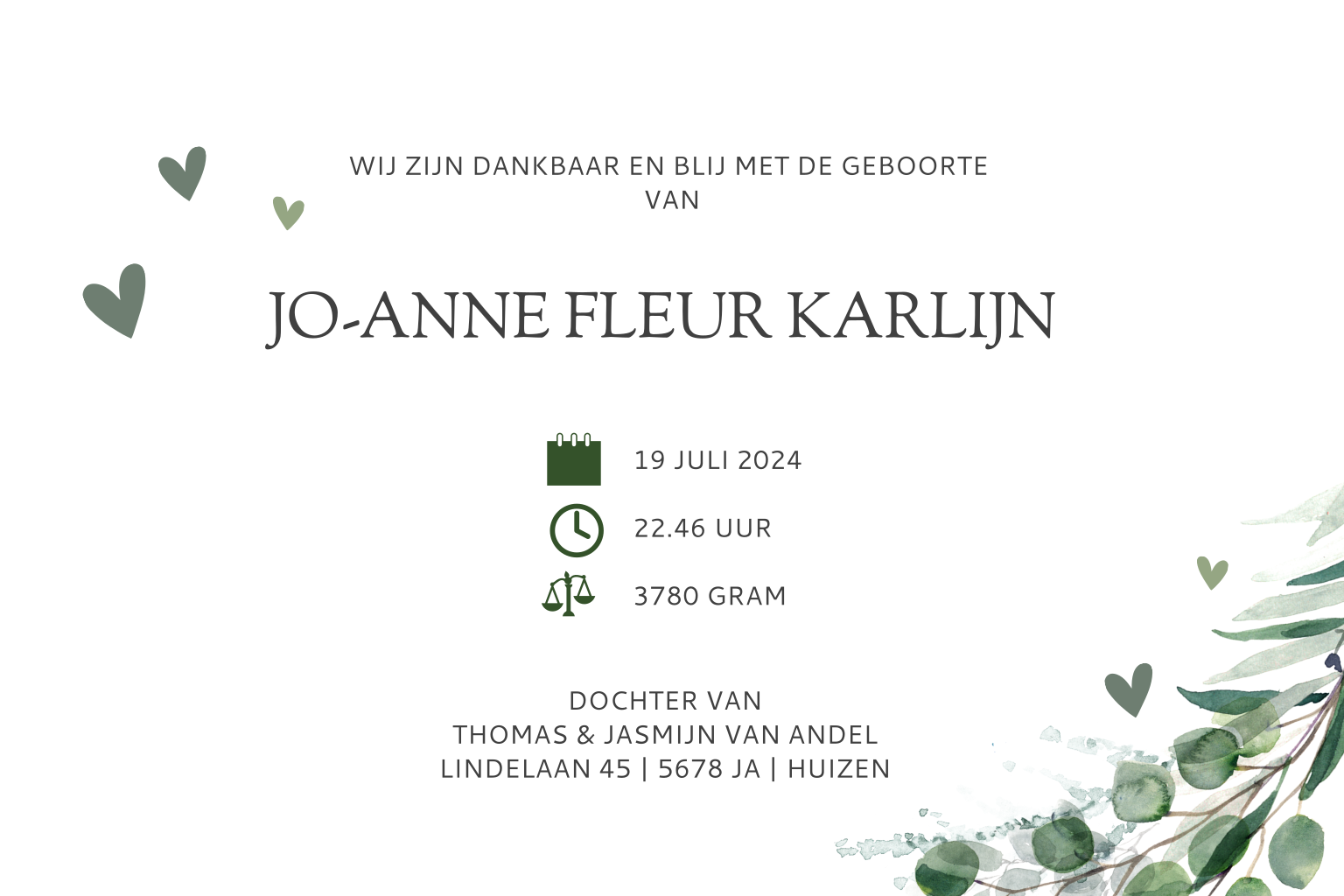 Hip geboortekaartje voor meisje met takjes en blaadjes van aquarel