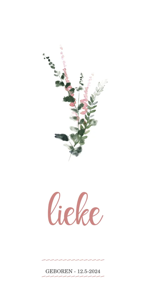 Hippe geboortekaart voor je pasgeboren dochter met stijlvol takje van aquarelverf in groen en roze.