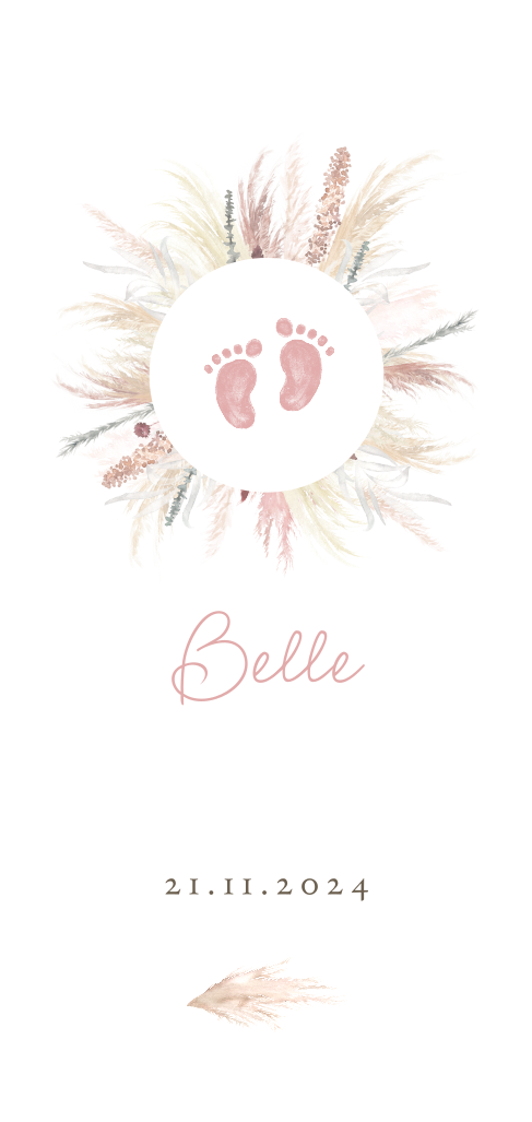 Natuurlijk geboortekaartje voor de geboorte van je dochtertje met waterverf pampasgras, droogbloemen en oudroze babyvoetjes.