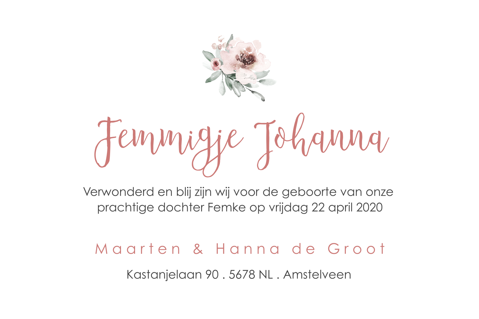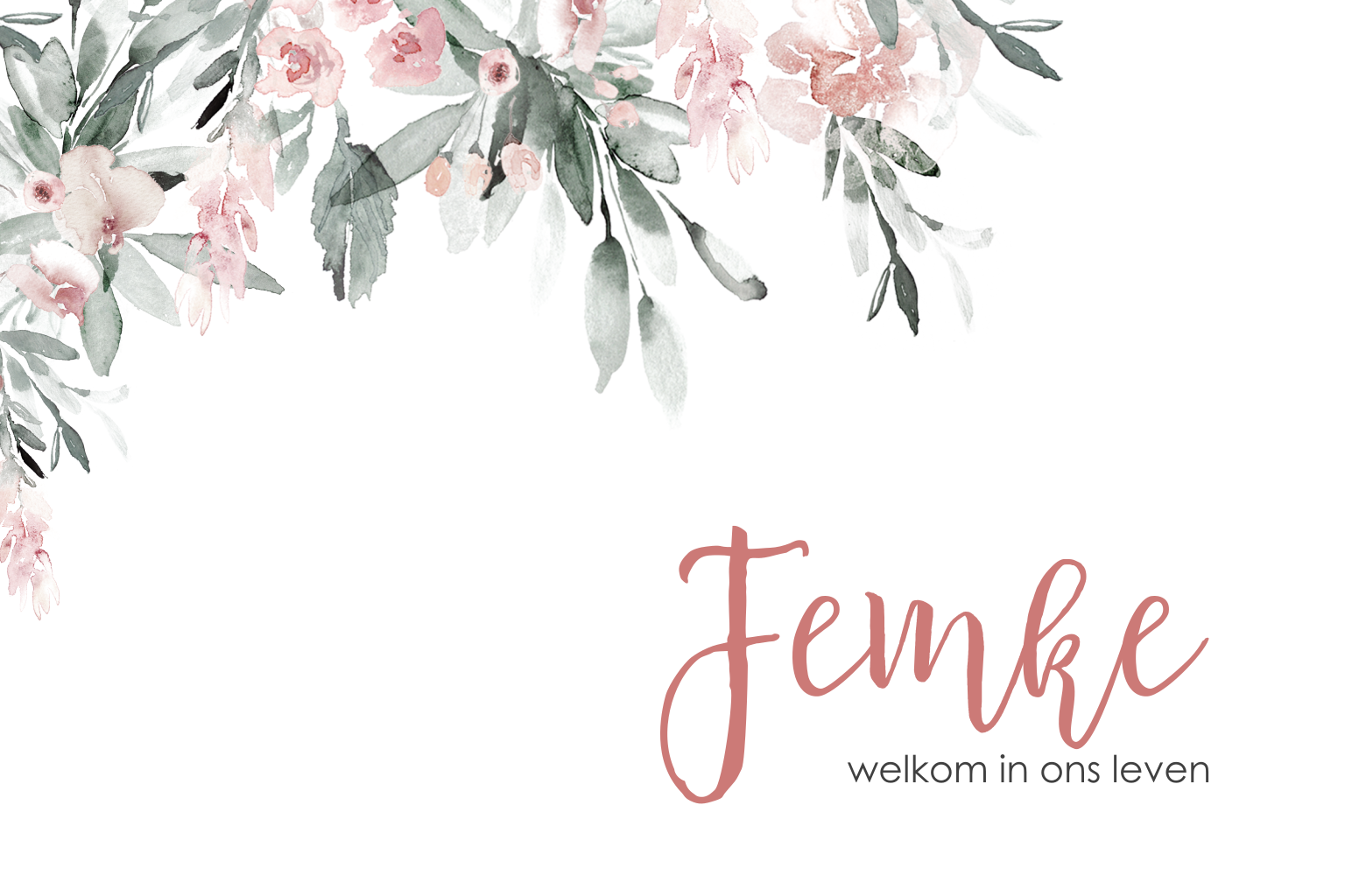 Stijlvol geboortekaartje met lieve bloemetjes geschilderd met waterverf in romantisch roze. Verander de achtergrondkleur en kies je eigen lettertype om een uniek geboortekaartje te maken!