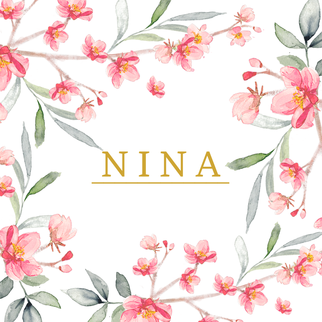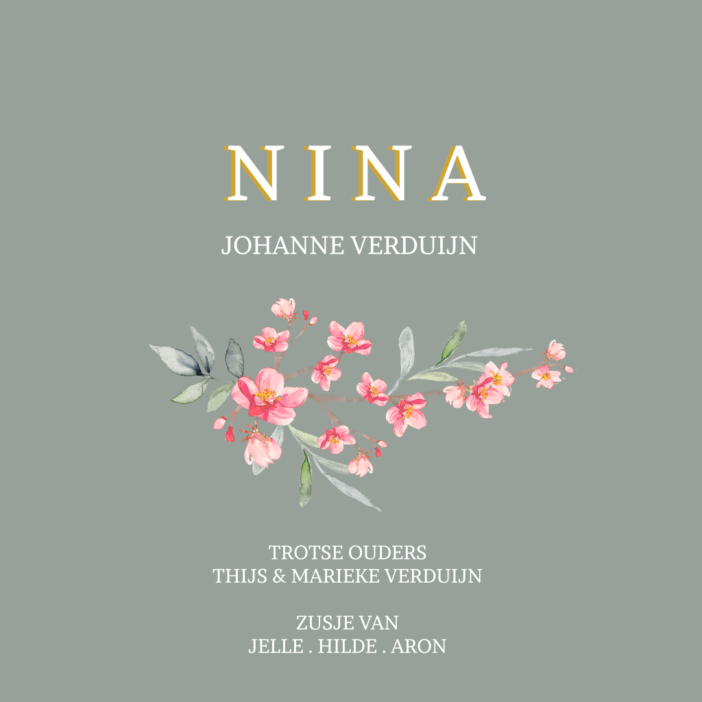 Wat een stijlvol geboortekaartje met een strak lettertype in goudlook met daaromheen roze bloesem! Dit watercolourkaartje is leuk voor de geboorte van een meisje. Hoe heet jouw kleintje?