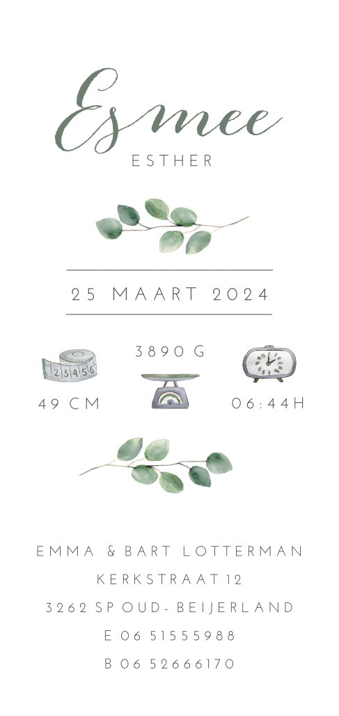 Eenvoudig en minimalistisch geboortkaartje voor je dochtertje met stijlvolle eucalyptus takjes. Kies als papiersoort Oud-Hollands en bestel een proefdruk om dit geboortekaartje in het echt te bekijken!