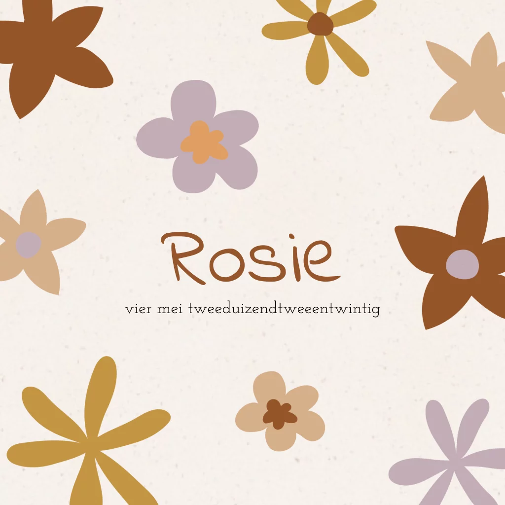 Dit is een lief geboortekaartje voor jullie dochter. Op het kaartje zijn bloemen in aardetinten te zien. Centraal op het kaartje staan de naam en geboortedatum. Het kaartje kan naar wens aangepast worden in onze online editor.