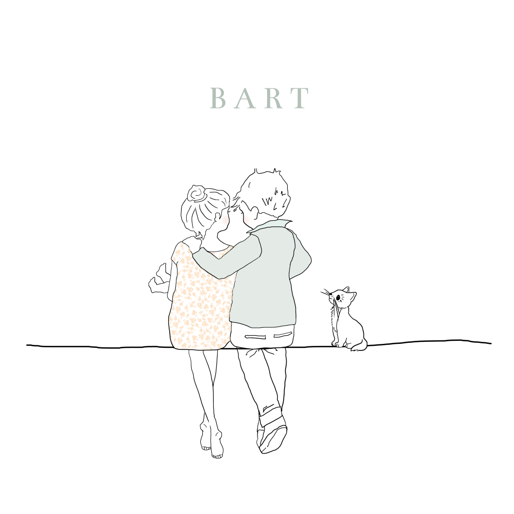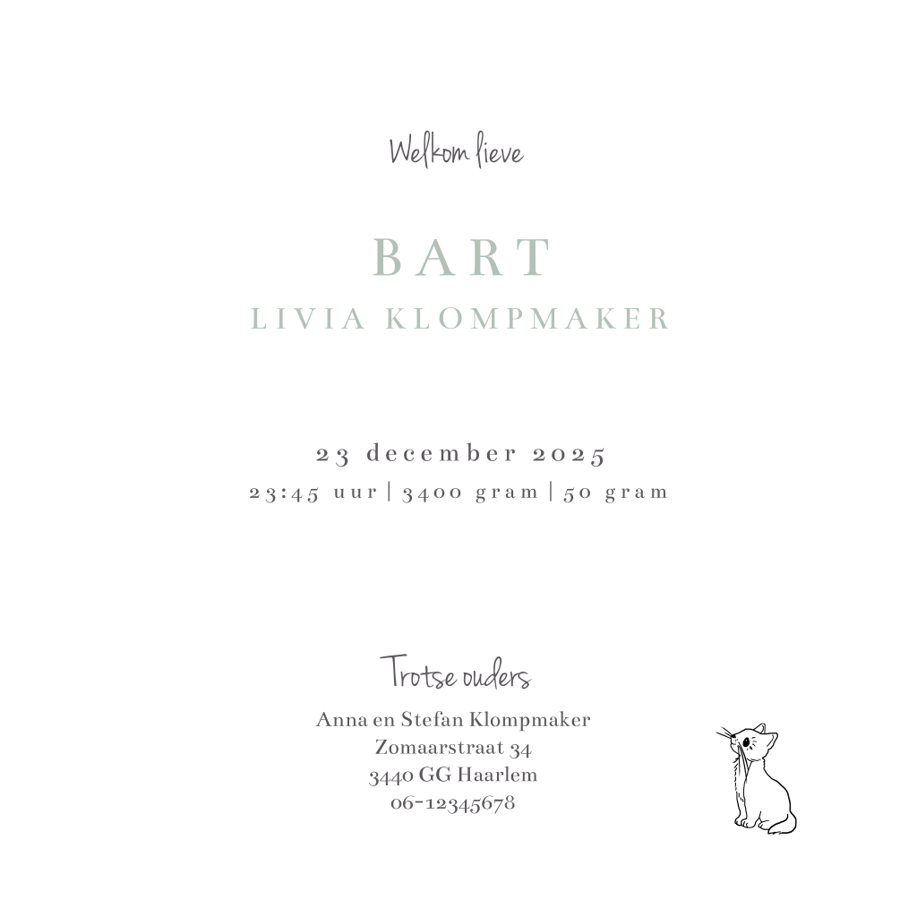 Hoera, een zoontje! Met dit getekende geboortekaartje met papa, mama en kat kondig je de geboorte van jouw kleine ventje aan. Teksten en kleuren zijn naar wens aan te passen in de editor. Hoe heet jullie zoon?